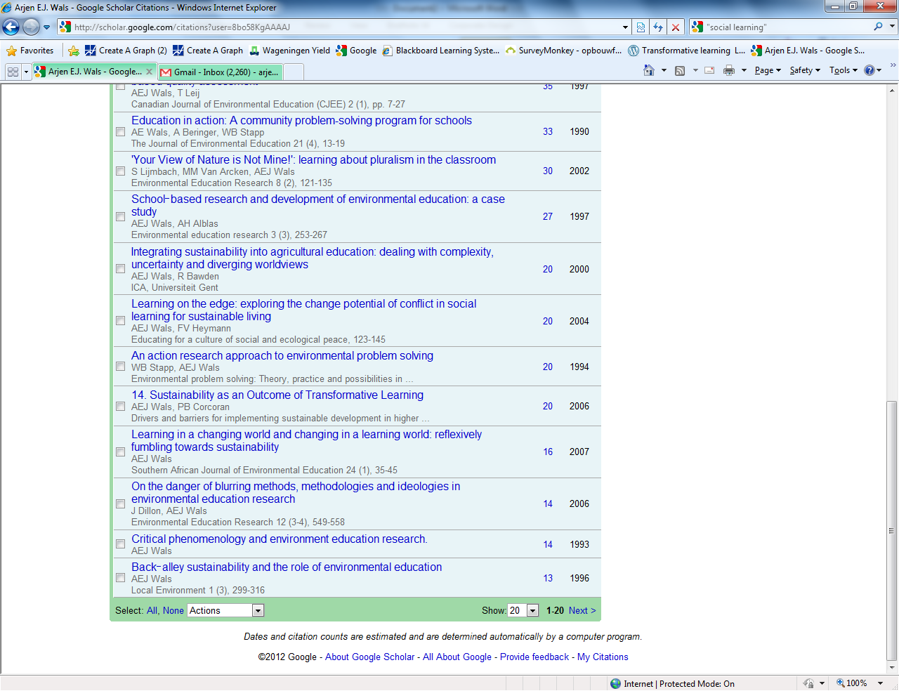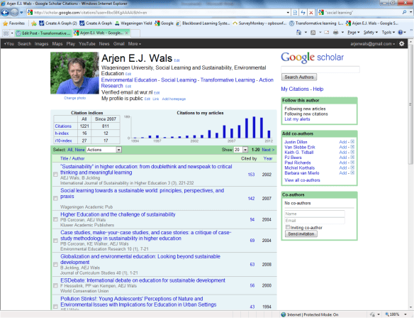 As you can see my overall h-factor is 16. Impressive? Hardly. But how can I raise it? Let me move to the crucial information google citations provides (if you want to check your own bibliometric data you need to make a profile on google citations!). You will note below that “Learning in a changing world and changing in a learning world: reflexively fumbling towards sustainability” is the crucial paper at this moment (click on the image to make bigger).