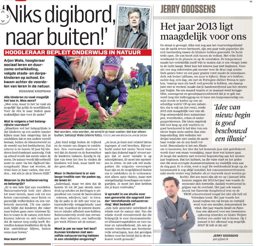With nowadays many people, young and older, all over the world spending 80-90 % of their waking hours behing a screen (smart phone, tablet, laptop,TV or PC – to mix it up a bit) it is time to refer back to a study on the impact of educational nature immersion programme’s on child development completed by Wageningen University back in 2012. The study received some national press at the time via an interview for the Dutch news paper ‘Het Parool’ which was also picked-up by another major paper ‘het Algemeen Dagblad’ in its first issue of 2013 (I have included a copy of the latter interview at the end of this post, in Dutch I’m afraid).