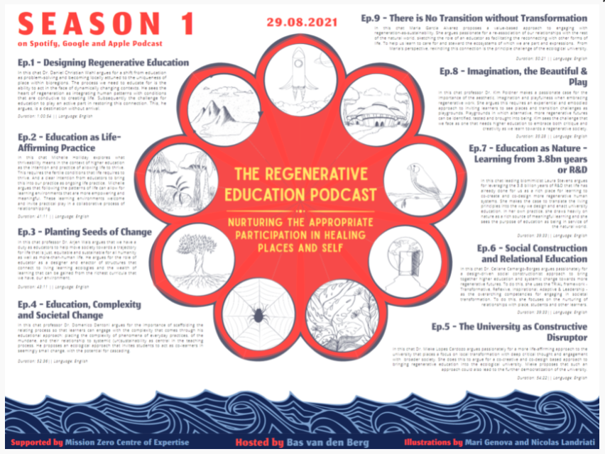 Last month the first of three microseasons of The Regenerative Education Podcast has been published on Apple Podcasts, Spotify, and Google Podcasts. In each episode, one om my PhDs, Bas van den Berg who is director of education of the Mission Zero centre of expertise at The Hague University of Applied Sciences, engages with a leading practitioner, professor, teacher, and/or activist that is trying to connect their educational practice to making the world a more equitable, sustainable and regenerative place.