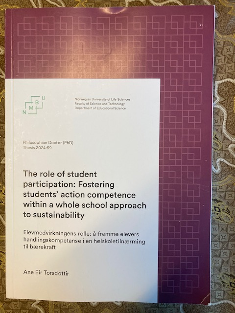 On Friday November 1st one of my Norwegian PhD Candidates successfully defended her dissertation. Over the past few years I have been working with colleagues both at Wageningen University and at the Norwegian Life Sciences University (NMBU) on researching the potential merits of so-called Whole School and/or Whole Institution Approaches (WSA/WIA) to sustainability. At NMBU there are currently four PhD-candidates doing research related to this, Ane Eir Thorsdottir is or rather, was one of them. Her work focusses on one aspect of the WSA which is critically important: students participation. In addition to myself, Prof Astrid Sinnes of NMBU and Dr. Daniel Olsson of Karlstad University in Sweden were her supervisors. Jan Cincera and Elin Saether (Olso Univerity) were her ‘ opponents’ .She has published three articles that are central in the dissertation: two in Environmental Education Research and one in Global Environmental Research.