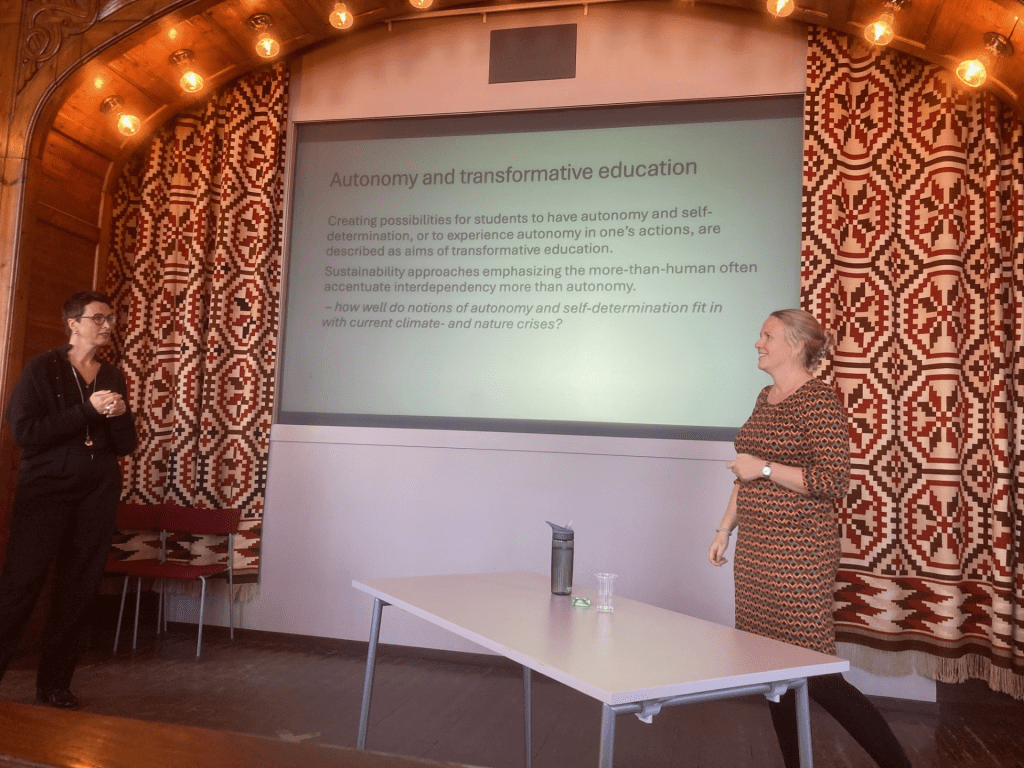 Elin Seather (left) having a dialogue with Ane (right) during the defence – posing an interesting question about autonomy and self-determination as pedagogical principles in a world that requires a decentering of ‘ self’ and opening up for ‘ other’ as well.