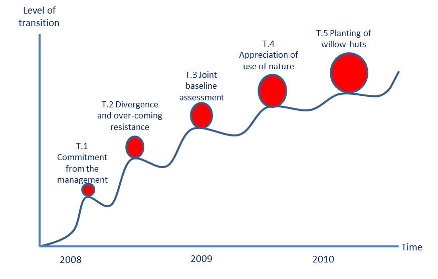 In this new paper a key policy ‘tool’ used in the Dutch Environmental Education and Learning for Sustainability Policy framework is introduced as a means to develop a sense of place and associated ecological mindfulness. The key elements of this tool, called the vital coalition, are described while an example of its use in practice, is analysed using a form of reflexive monitoring and evaluation. The example focuses on a multi-stakeholder learning process around the transformation of a somewhat sterile pre-school playground into an intergenerational green place suitable for play, discovery and engagement. Our analysis of the policy-framework and the case leads us to pointing out the importance of critical interventions at so-called tipping points (see the figure below) within the transformation process and a discussion of the potential of hybrid learning in vital coalitions in strengthening ecological mindfulness. This paper does not focus on establishing an evidence base for the causality between this type of learning and a change in behavior or mindfulness among participants as a result contributing to a vital coalition but rather focusses on the conditions, processes and interventions that allow for such learning to take place in the first place.