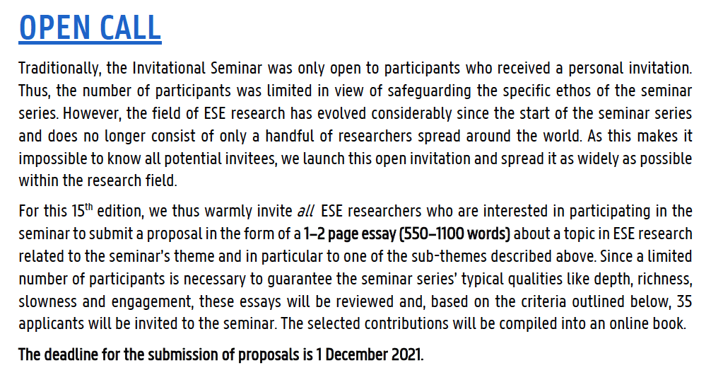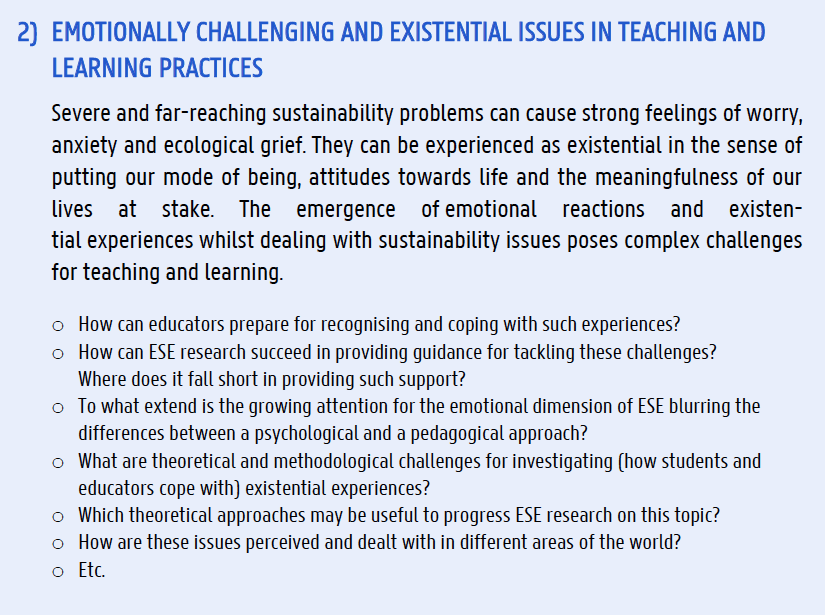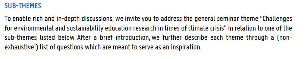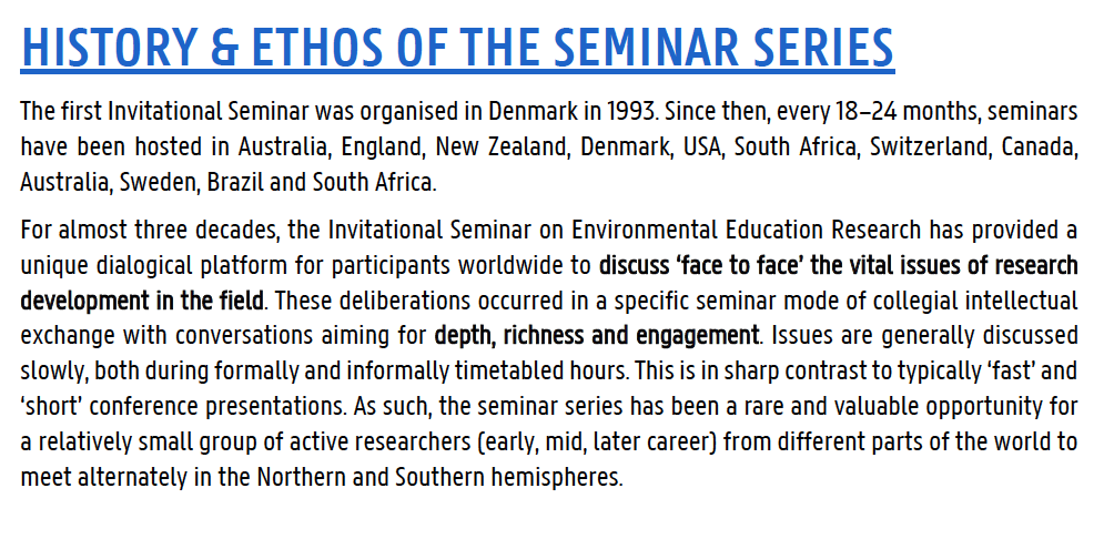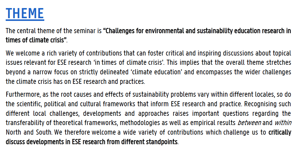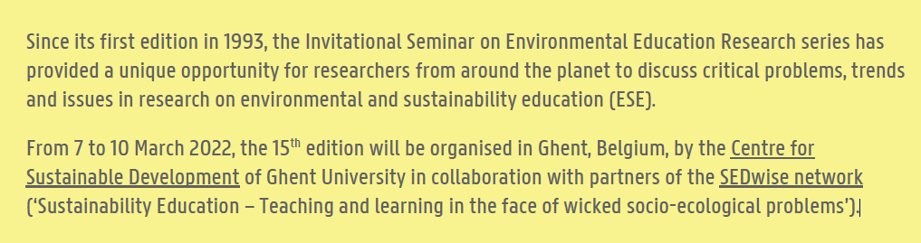 I am happy to announce the return of the infamous Invitational Research Seminars on Environmental & Sustainability Education. As one of the co-organisers I have the privileged to be part of an excellent group led this tim by Katrien van Poeck of Ghent University in Belgium. These are relatively small seminars. While they are no longer ‘by invitation only’ and open to anyone with a strong, insightful, creative, provocative, etc, proposal, spaces will be limited. Have a look a the key info, the theme and the wonderful sub-themes below or go directly to the Centre for Sustainable Development at Ghent University https://www.cdo.ugent.be/news/call-proposalshttps://forms.office.com/pages/responsepage.aspx?id=3hyB1-_sbEmPkaF4YkG5nAXy6iDz_itPuL2K0IeXr0VUOFA5NUdJTzNPVkZHRTRLQVNGMVRRN0c5Ni4u